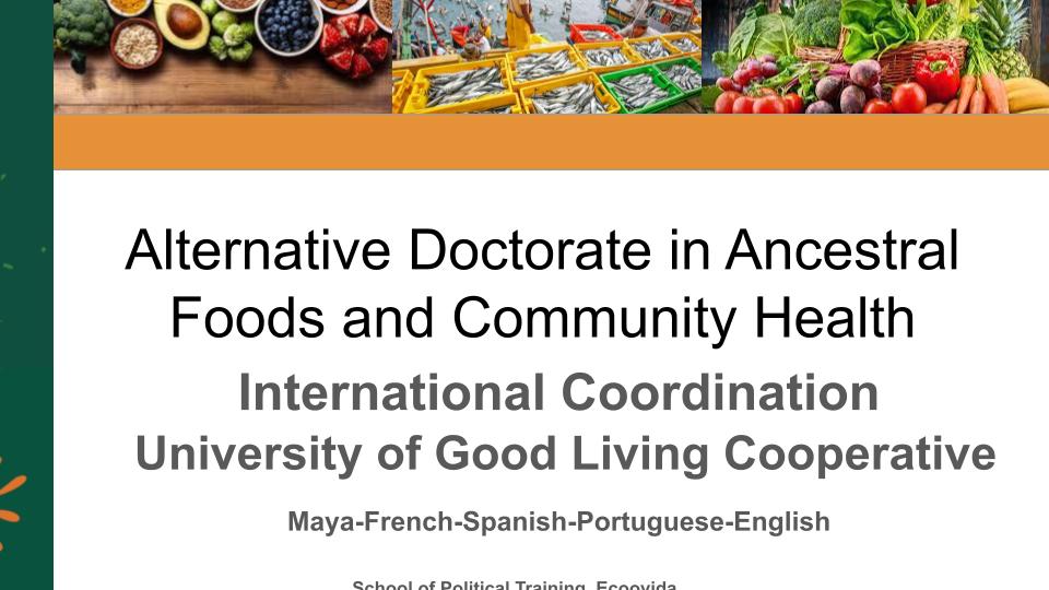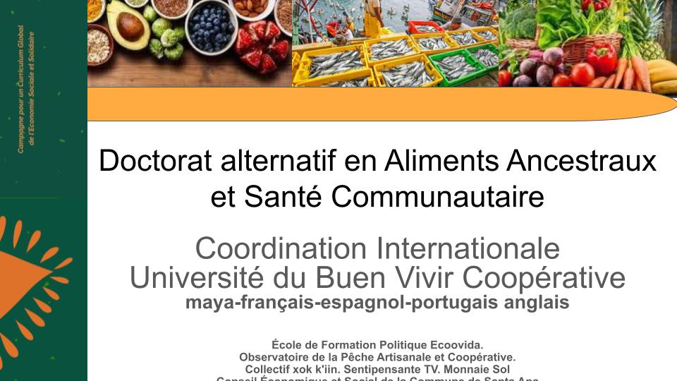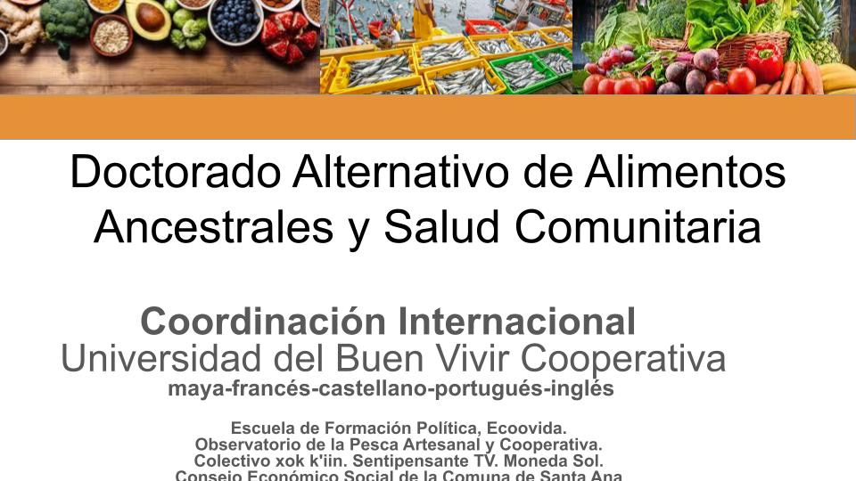 El Doctorado Alternativo de Alimentos Ancestrales y Salud Comunitaria es una iniciativa de la Universidad del Buen Vivir Cooperativa en articulación con la Escuela de Formación Política, Ecoovida. Observatorio de la Pesca Artesanal y Cooperativa. Colectivo xok k’iin. Sentipensante TV. Moneda Sol.Consejo Económico Social de la Comuna de Santa Ana. Se dicta en idioma maya- francés-castellano-portugués-inglés Inicia el proceso de formación/investigación 22 de Enero 2026