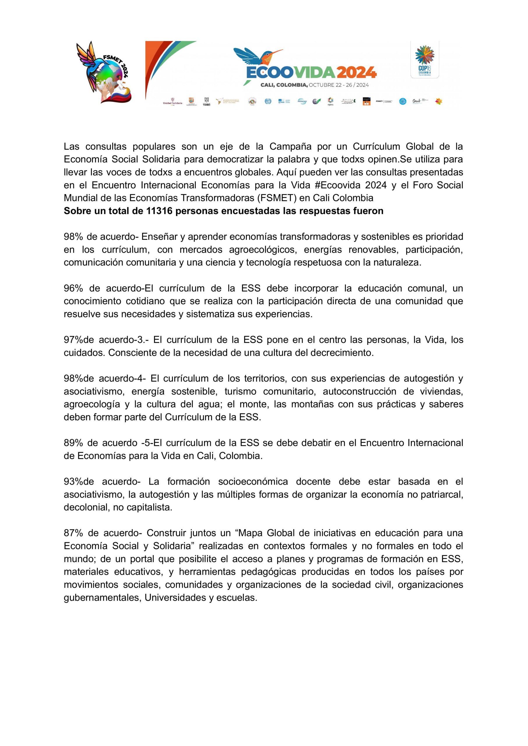 Las consultas populares son un eje de la Campaña de Currículum para democratizar la palabra y que todxs opinen.Se utiliza para llevar las voces de todxs a encuentros globales. Aqui pueden ver las consultas presentadas en #Ecoovida 2024 y FSMET Cali Colombia en castellano, catalán, portugués, euskara, árabe, inglés, francés, gallego, italiano