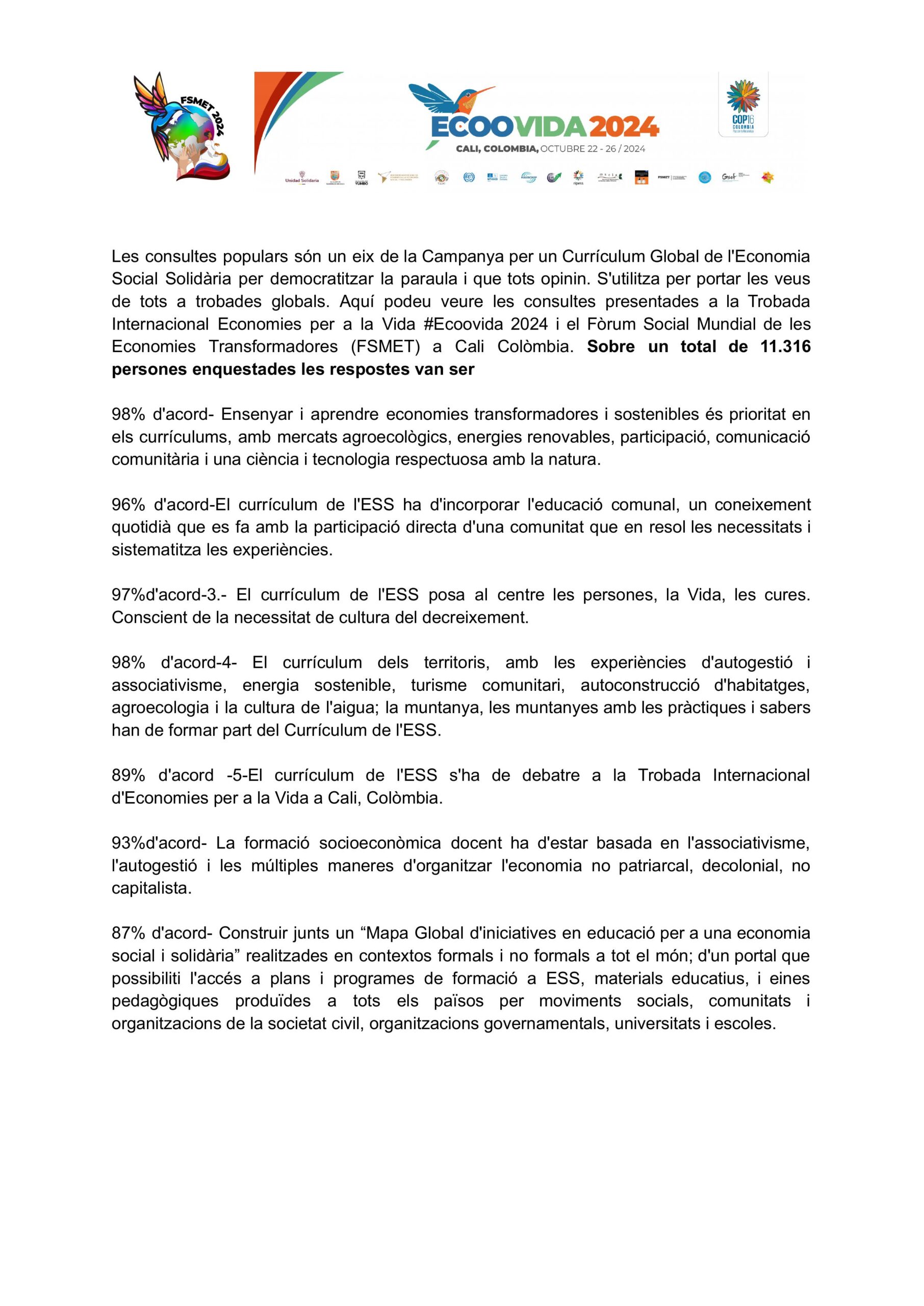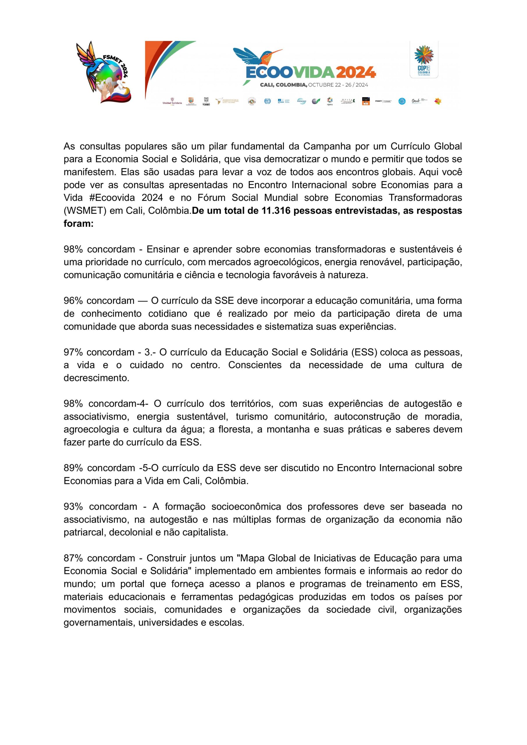As consultas populares são um pilar fundamental da Campanha Curricular para democratizar o mundo e permitir que todos se manifestem. Elas são usadas para levar a voz de todos a encontros globais. Você pode ver as consultas apresentadas na #Ecoovida 2024 e no FSMET Cali, Colômbia em espanhol, catalão, português, basco, árabe, inglês, francês, galego, italiano
